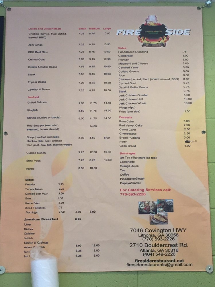 Introducing Fireside Jamaican Restaurant, a Caribbean gem located in Atlanta, GA. This casual yet classy spot offers a variety of Jamaican breakfast options like Salt Fish, Callaloo, and Ackee & Saltfish. For lunch and dinner, indulge in flavorful platters such as Chicken, Jerk Wings, Curried Goat, Oxtails & Butter Beans, and Stew Beef. Seafood lovers won't be disappointed with the Grilled Salmon, Kingfish, Shrimp, Red Snapper, and a delicious Veggie Stew Peas. With vegan options, free Wi-Fi, outdoor seating, and a welcoming atmosphere, Fireside Jamaican Restaurant is perfect for any occasion. Don't miss out on the authentic Jamaican flavors and exceptional service at Fireside Jamaican Restaurant.